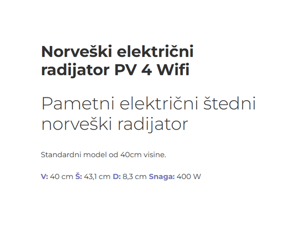 Beha Norveški radijator električni PV4 400W Wi-Fi razvijen je na temelju više od 100 godina iskustva tvrtke BEHA. Dizajniran u Norveškoj, zadovoljava najviše standarde kvalitete i sigurnosti te je u potpunosti usklađen s EU ECO DESIGN direktivom.
